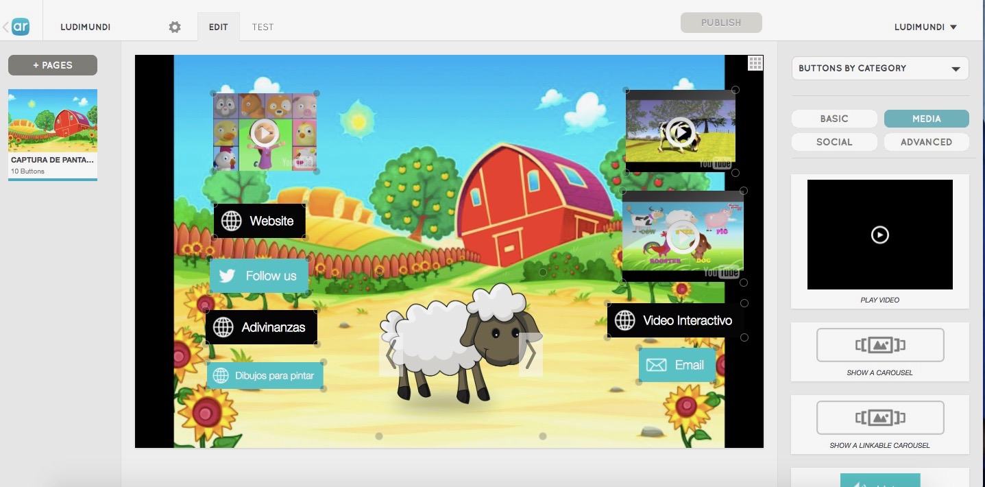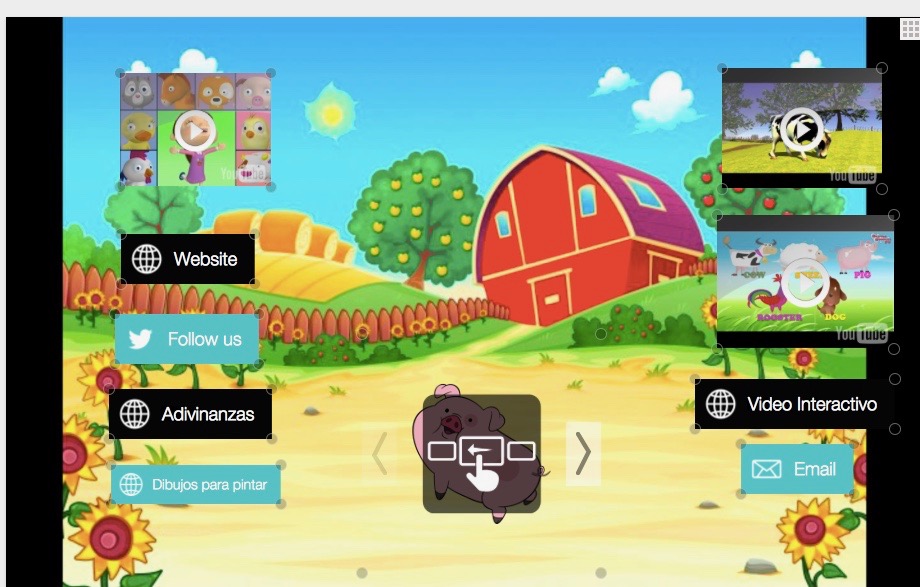 En este caso, hemos basado nuestro "Layar" en los animales de la granja en el que hemos incluido tres videos relacionados con canciones y animales de la granja, además de uno de ellos en inglés. Otra de las pestañas que podemos observar es un video interactivo, con la ayuda del croma para aprender los diferentes animales de la granja. Además hemos añadido adivinanzas, dibujos para colorear entre otros de esta manera la persona podrá tener más recursos solo con un click.